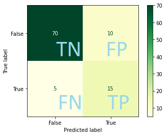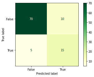 \[precision = TP / (TP + FP) = 15 / (15+10) = 0.6\] \[recall = TP / (TP + FN) = 15 / (15+5) = 0.75\]